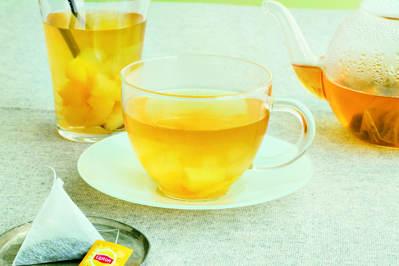 1:「リプトン グリーンティー ピーチティーバッグ」に湯または水を注ぎ、パッケージの表示時間どおりに抽出する。桃は缶汁をきって1㎝角に切り、アロエはシロップをきる。
