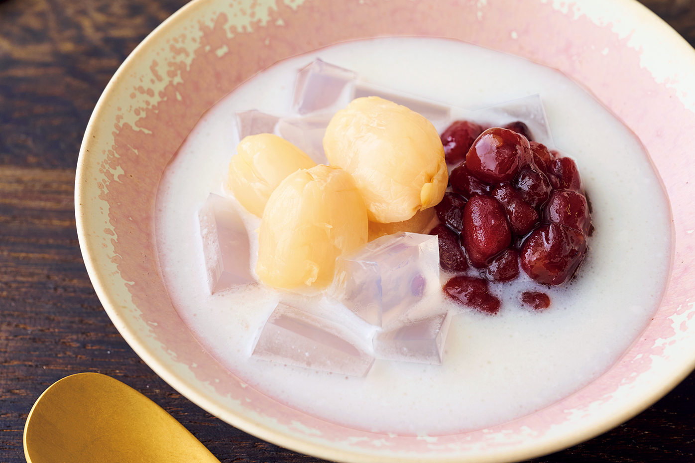 3:器にココナッツミルクを注ぎ、1とゆであずきを盛り、ライチをのせる。