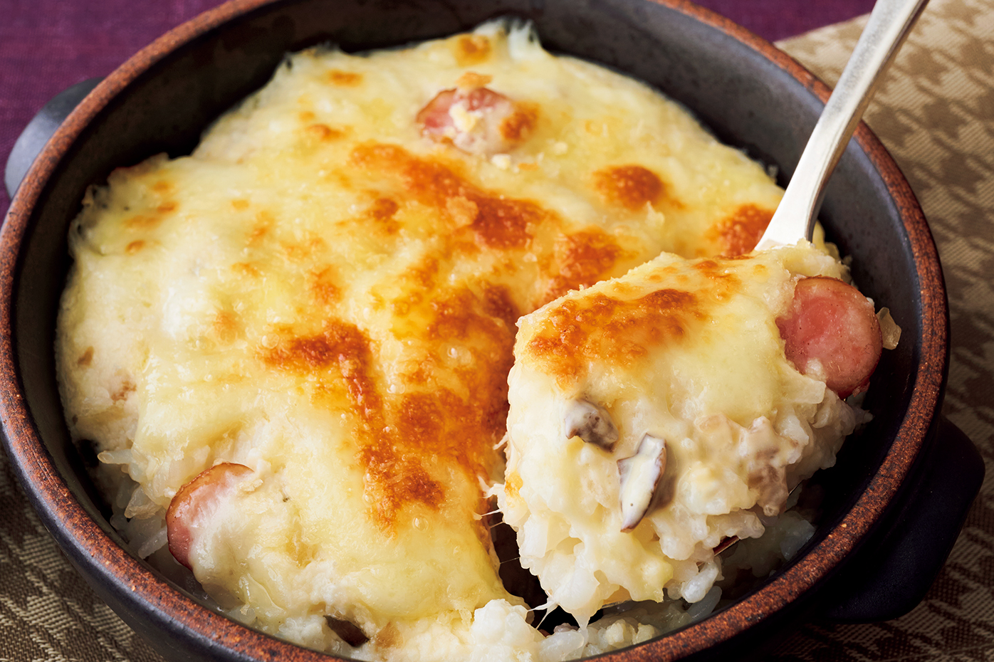 2:グラタン皿に入れてならし、ソースをかける。チーズをのせてパン粉適量をふり、オーブントースターでこんがりと焼き色がつくまで7~8分焼く。